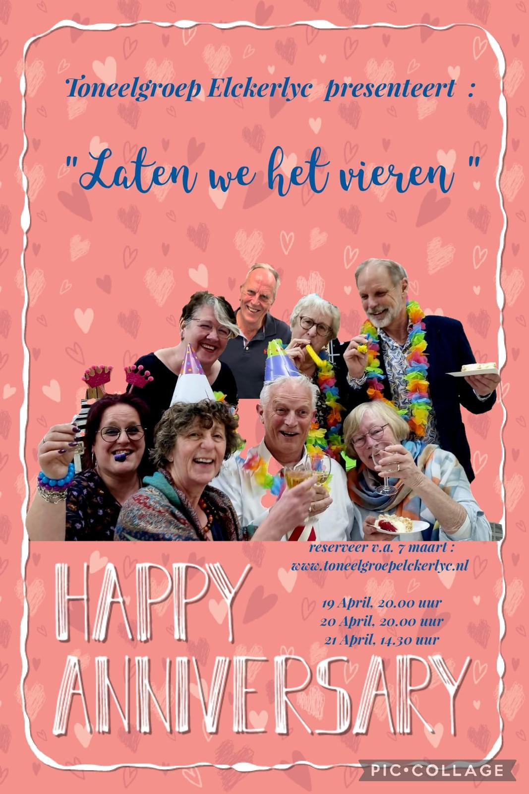 Na de succesvolle voorstelling van vorig jaar “Momenten van Geluk”, van de bekende toneelschrijver Alan Ayckbourn, kiest Toneelgroep Elckerlyc weer voor een grote schrijver. Dit jaar wordt “Laten we het Vieren” van Paul Haenen gespeeld.
